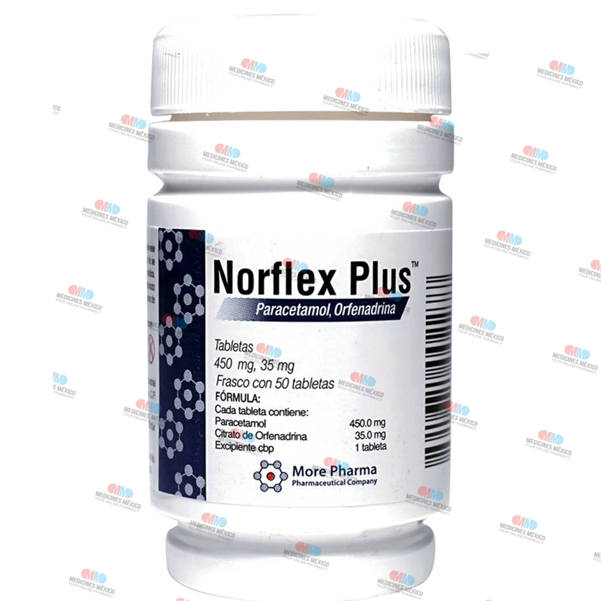 Norflex Plus Orphenadrine is a drug to relax the muscles and relieve spasms, available as tablets for oral administration. The package contains 50 tablets. Each tablet contains 35 mg of orphenadrine and 450 mg of paracetamol.